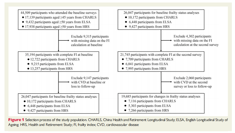 因此,本研究旨在通过分析三个前瞻性队列(中国健康与养老追踪调查 CHARLS 、英国老龄化纵向研究 ELSA 和美国健康与退休研究 HRS )的数据,探讨衰弱状态的变化与 CVD 发病风险之间的关系。研究假设是:衰弱状态的进展会增加 CVD 的发病风险,而衰弱状态的恢复则会降低 CVD 的发病风险。