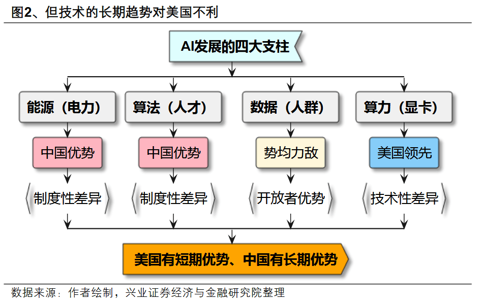 但中期来看,美股的基本面逻辑(AI霸权)或终将被证伪。在对AI发展至关重要的四个领域(能源、算法/人才、数据、算力)中,美国在能源(电力基础设施)领域处于劣势;算法(人才)上不占优势;在数据领域,“美国优先”动摇了其制度性开放的根基,导致美国的劣势也在扩大;而其仅存的算力(显卡、芯片)优势也并非牢不可破。从这个角度来说,尽管美国AI发展似乎有领先优势,但时间并不在美国一边。未来,类似今年初的“Deepseek时刻”出现的频率可能会逐渐增加,并最终动摇市场对这一支柱的信心。