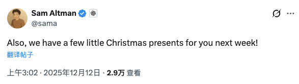 作为OpenAI对谷歌的“反击”,GPT‑5.2仅仅是打出的“第一拳”。公司CEO奥尔特曼在周四宣布,下周会给用户们带来一些“小小的圣诞礼物”。他也在周四表示,Gemini 3对公司各项指标的影响比原本担心得要小。他还说,预计OpenAI将在明年1月“以非常强劲的姿态”退出目前的红色警报状态。