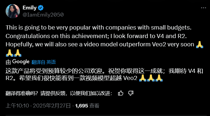 另一个网友也在线许愿,梦了票大的。除了R2以外,她还期待新一代基础多模态模型V4发布。最后,她还说希望DeepSeek进军文生视频领域,推一款能超过Veo2(Google DeepMind推出的一款先进的AI视频生成模型)的模型。
