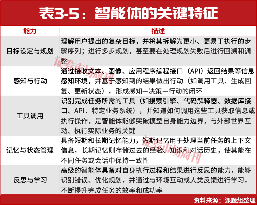 自 2023年3月AutoGPT发布以来,学界与工业界涌现出大量开源智能体框架,借助这些工具,开发者可将大语言模型扩展为具备具体任务执行能力的智能体,有效简化自动化业务流程。2025年3月,全球首个通用智能体 Manus发布,该智能体具备独立逻辑推理与系统任务规划能力,可通过编码执行、网页浏览、数据分析等工具,完成复杂任务的全流程解决方案交付,拓展了通用智能体的能力边界,为各行业智能化变革提供了全新的技术范式(见表3-5)。