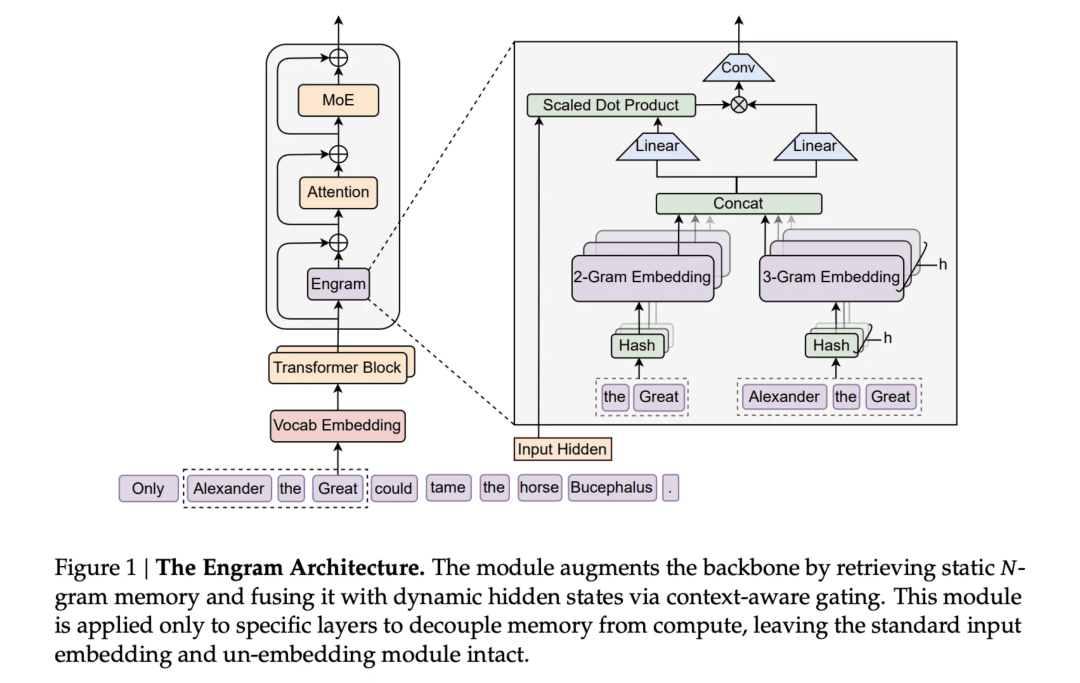计算与记忆解耦: 现有的模型为了获取基本信息,往往需要消耗大量昂贵的计算力来进行检索。Engram 技术能让模型高效地查阅这些信息,而不需要每次都浪费算力去计算 。