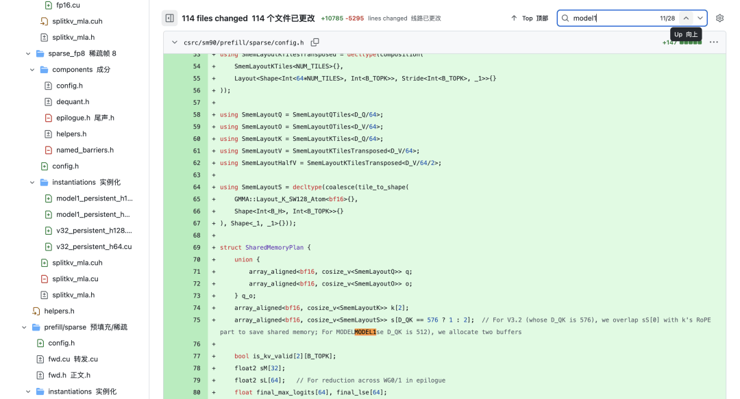 在代码逻辑结构中,「MODEL1」是作为与「V32」(即 DeepSeek-V3.2)并列的独立分支出现的,这一细节意味着「MODEL1」并不共享 V3 系列的参数配置或基础架构,而是一个全新的、独立的技术路径。