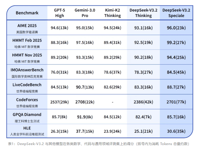 DeepSeek-V3.2:主打 “平衡实用”,既能在智能体评测中拿下开源模型最高水平,缩小与闭源模型的差距,又在推理类 Benchmark 测试中追平 GPT-5,仅略逊于 Gemini-3.0-Pro。更关键的是,它解决了此前同类模型 “输出冗长” 的痛点 —— 相比 Kimi-K2-Thinking,输出长度大幅降低,这意味着用户等待时间缩短、企业计算成本下降。对普通用户来说,日常使用时 “响应快、答案准” 的体验会更明显;对企业而言,成本降低直接提升了 AI 技术落地的性价比,这正是 AI 商业化推进的关键一步。